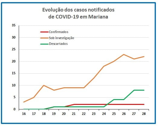 Neste sábado, a Secretaria Municipal de Saúde notificou mais um caso suspeito de coronavírus em Mariana. A situação dos casos confirmados e descartados continua a mesma em função da não liberação de resultados dos exames. De acordo com o Boletim Informativo, divulgado no início da noite deste sábado (28), no estado de Minas Gerais há 22.974 casos suspeitos, 205 casos confirmados, 18 óbitos em investigação e nenhum óbito confirmado até o momento.