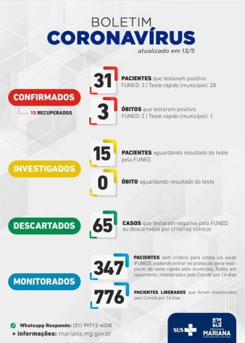 De acordo com o secretário de saúde, a situação no município não sofreu alterações nas últimas 24h, em termos de casos confirmados, mas nove casos testados hoje deram resultado negativo. Mariana conta, nesta data, com 15 casos em investigação, 65 descartados, 347 pacientes monitorados em isolamento domiciliar, já tendo sido atingida a marca de 776 pessoas liberadas após acompanhamento por 14 dias.