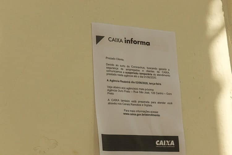 Na segunda-feira (01), a agência da Caixa em Mariana foi fechada para higienização, diante de risco de contaminação detectado. A agência foi reaberta no dia seguinte para continuar a realização de serviços essenciais. “O banco ressalta que o fechamento de agências para higienização é dinâmico e ocorre sempre que é identificado qualquer nível de risco de contaminação, visando à proteção dos empregados, clientes e parceiros”, diz a nota da Caixa.