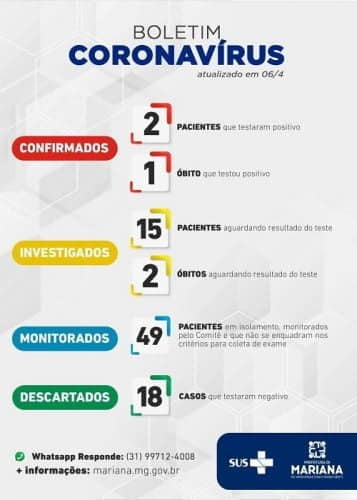 No último dia de março Mariana conta com 33 notificações, sendo 20 em investigação (incluindo um óbito), 11 descartados e dois casos confirmados. Esses casos que testaram positivo, de acordo com o Secretário Municipal de Saúde, já são considerados recuperados.