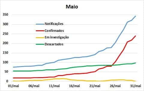No gráfico acima as 3 “ondas” de evolução da pandemia em Mariana, durante o mês de maio, podem ser facilmente identificadas. Assim o município termina o mês com 1 caso em investigação, 97 descartados (entre eles 7 óbitos por outras causas) 246 casos confirmados (incluindo 7 óbitos com resultados positivos para a Covid-19). Em relação a 30 de abril, os aumentos são de 371% nas notificações, casos confirmados, 1278% nos casos confirmados, e 700% nos óbitos. Aumentam em 455% os casos descartados e 142% os pacientes liberados do monitoramento. Em relação aos casos considerados recuperados, o aumento é de 387%, mas tomando como base o número do dia 13 de maio, primeira vez em que a informação foi incluída no Boletim Coronavírus.