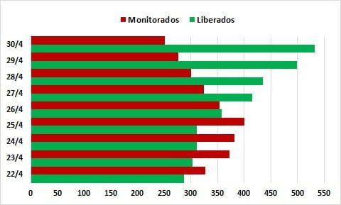Já o segundo gráfico (à direita), passível de análise apenas a partir de 22 de abril, mostra o crescimento do número de liberados do monitoramento, principalmente a partir do dia 26 de abril.