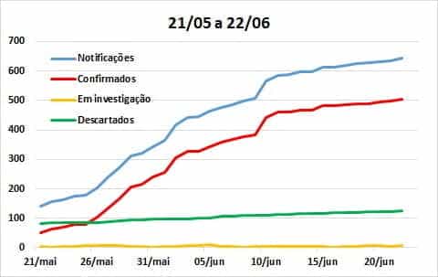 A observação das curvas de evolução dos casos nos 22 dias de junho, comparados com os 10 últimos dias de maio, demonstram que o crescimento dos casos confirmados e do total de notificações teve uma ligeira melhora.