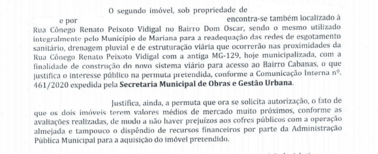 O projeto de lei que tramita na Câmara de Mariana solicita autorização da Casa Legislativa para que a Prefeitura troque um terreno que pertence ao município, localizado rua Cônego Renato Peixoto por outro, situado na mesma rua, de propriedade privada. Na justificativa, a Prefeitura apresentou a necessidade de realização de “obras de readequação nas redes de esgotamento sanitário” da região para a construção do novo acesso.