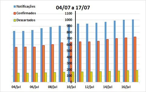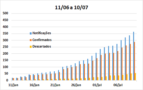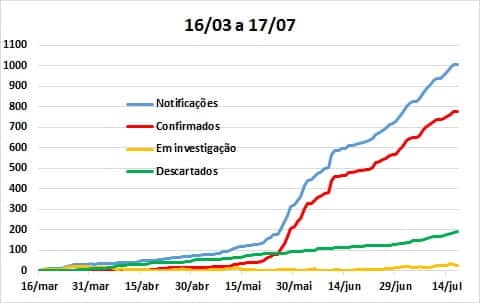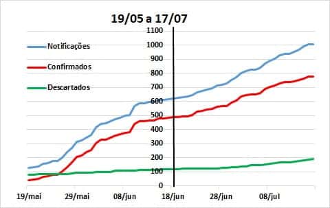 As linhas das notificações e dos casos confirmados mantêm a tendência de menor velocidade de crescimento, como apontado na atualização do dia 11/07, com menor inclinação a partir de 11 de junho, porém ainda a um ritmo médio de aproximadamente 12 novas notificações e 9 resultados positivos a cada dia.