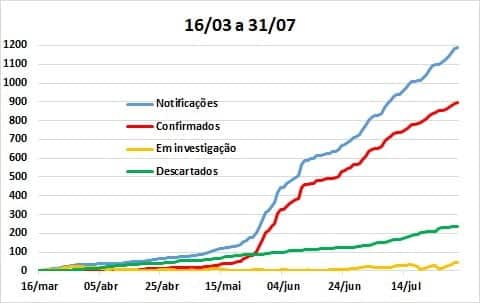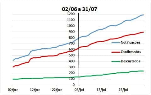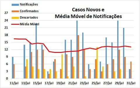 No gráfico acima são apresentados os números de novas notificações, casos confirmados e descartados, no período de 11 a 31 de julho, juntamente com a linha em vermelho que representa as médias móveis. Considerando-se os últimos 14 dias (18 a 31), a média móvel mostrou queda de 50% no dia 17, em comparação com o dia 3, mas voltou a subir atingindo queda de 24,4% no dia 24 e crescimento de 10,4% no dia 31. Esses números confirmam que houve um pico aparente no início do mês de julho, mas a tendência de queda foi revertida nas semanas seguintes, apresentando um caráter de estabilidade em função dos números apresentados no último boletim disponível antes desta publicação (31 de julho).