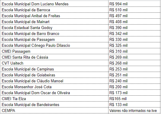 Ainda segundo o prefeito de Mariana, os recursos serão aplicados em 19 escolas da rede municipal. A maior quantia será investida na Escola Municipal Dom Luciano Mendes, localizada no Alto Rosário, que receberá R$ 994 mil. Entre os distritos, Passagem de Mariana será o mais beneficiado, com a previsão de reforma de duas escolas municipais. A Secretaria Municipal de Obras foi procurada mas, até o fechamento desta matéria, não informou sobre a previsão de início e término das obras nas escolas de Mariana.