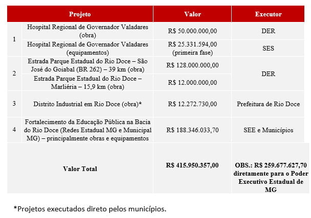 No último dia 4, foi homologado na 12ª Vara Federal um acordo entre a Fundação Renova e o Fórum Permanente de Prefeitos do Rio Doce. O acordo prevê a liberação de R$ 416 milhões para ações de reparação em municípios da bacia. Desse montante, pouco mais de R$ 75 milhões serão para obras e equipamentos do Hospital Regional de Governador Valadares. Outros R$ 140 milhões serão destinados a obras na Estrada Parque Estadual Rio Doce. Há, ainda, a previsão de liberação de mais de R$ 12 milhões para a construção do Distrito Industrial da cidade de Rio Doce.