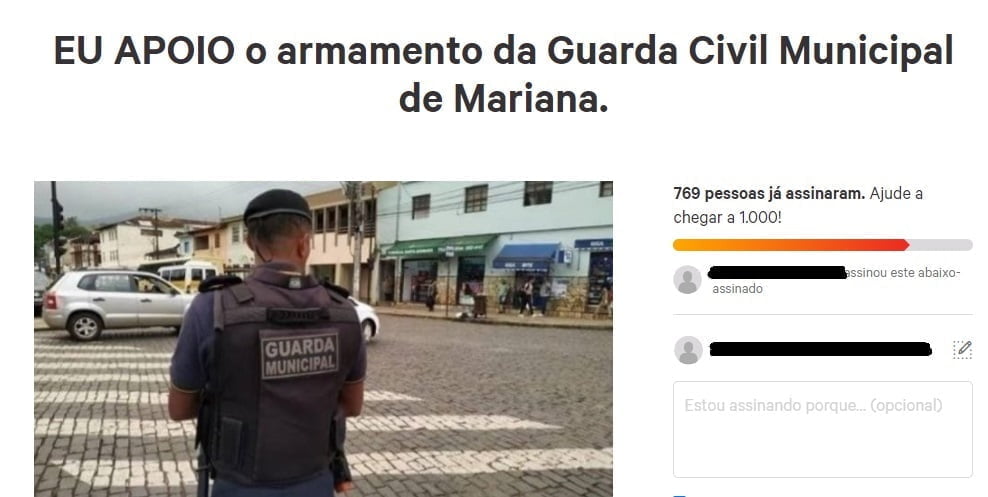 Depois da primeira votação do projeto no plenário da Câmara, dois abaixo-assinados virtuais surgiram sobre o tema: um favorável e outro contrário à liberação do porte de arma de fogo para a Guarda Municipal de Mariana.