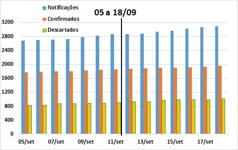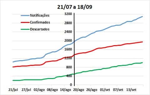 A comparação dos últimos 30 dias (21/07 a 18/09) com igual período anterior à última atualização (13/08 a 11/09), demonstra que praticamente não houve modificação na taxa de crescimento das notificações, resultados positivos e casos descartados, pelo menos nas últimas 3 semanas.