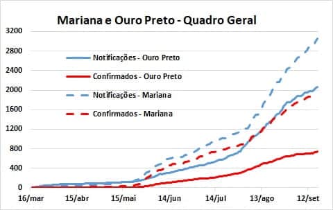 Em conjunto, Mariana, Ouro Preto e Itabirito tiveram acréscimo de 341 notificações, correspondente a aumento de queda de 51,6% em relação à semana de 05 a 12/09. Em Mariana ocorreu queda de 14,3%, mas em Ouro Preto e Itabirito os aumentos foram respectivamente de 95,2 e 112,1%.