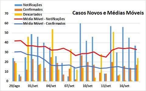 A média móvel máxima dos casos notificados atingiu 35 (um caso a mais por dia na média do período) e a dos confirmados teve nova redução, caindo para 15 casos diários. Com isso, a relação entre casos confirmados e notificados continua em queda, baixando para aproximadamente 43%.