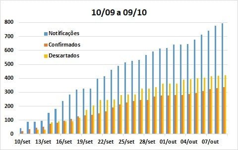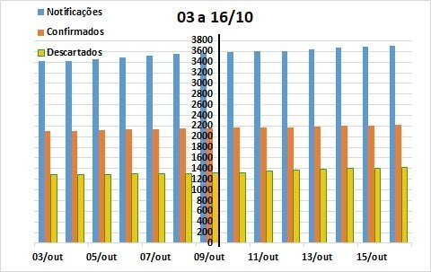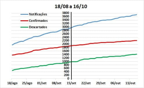 A comparação dos últimos 30 dias (18/09 a 16/10) com igual período anterior à última atualização (10/09 a 09/10), continua demonstrando alteração praticamente inexistente no padrão de crescimento da taxa de notificações, resultados positivos e casos descartados.