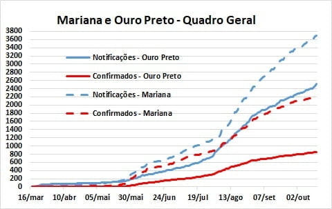 Voltando a apresentar a comparação da evolução da pandemia em Ouro Preto e Mariana, continua a tendência de similaridade de crescimento dos casos notificados em Ouro Preto e os confirmados em Mariana.