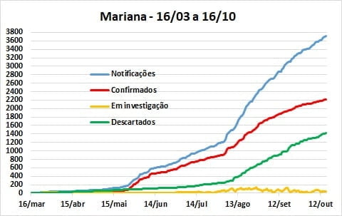 No gráfico acima são apresentadas as evoluções das notificações, confirmações, casos em investigação e descartados em Mariana, desde o anúncio do primeiro caso, ocorrido no dia 16 de março. Desde a segunda semana de agosto as notificações e os casos descartados continuam com praticamente a mesma tendência de crescimento, enquanto a curva dos casos com resultados positivos apresenta inclinação menor e estável desde o final do mesmo mês.