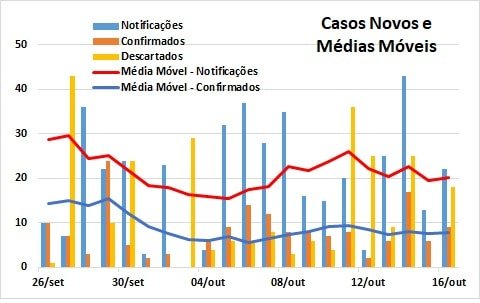 Observou-se um ligeiro aumento nas médias móveis máximas dos casos confirmados diariamente (de 8 para 9) e dos casos notificados (de 23 para 26), representando 34,6% de casos confirmados em relação aos notificados.