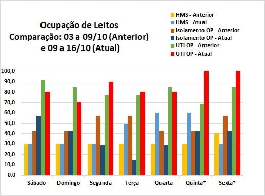 Desde o dia 10 de outubro, não mais estão disponíveis 3 leitos de UTI instalados na Santa Casa de Misericórdia de Ouro Preto por convênio da instituição com os municípios de Mariana, Ouro Preto e Itabirito. Com isso, as taxas de ocupação apresentadas no gráfico abaixo, relativas aos últimos 7 dias (10 a 16/10), são correspondentes a apenas a 10 leitos de UTI. Assim, a taxa média de ocupação dos leitos de UTI disponíveis subiu para 85,7%, correspondendo à média de 9 pacientes por dia utilizando esses leitos. Entretanto, para efeito de comparação, a taxa média seria de 65,9% se considerados os 13 leitos. Já a taxa de ocupação dos leitos de isolamento da Clínica Médica do Hospital Monsenhor Horta subiu para 41,4% (alta de 10 pontos percentuais), enquanto na Santa Casa caiu de 49 para 36,7% nos últimos 7 dias.