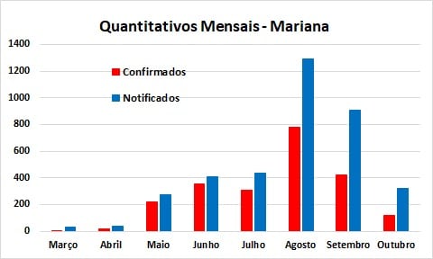 Abaixo são apresentados os quantitativos mensais de casos notificados e confirmados em Mariana, ressaltando-se que os resultados de março se referem a 16 dias (de 16 a 31/03), enquanto os de outubro são relativos aos 16 primeiros dias do mês. Projetando para 31 dias a mesma média observada até agora no mês, as notificações atingirão 620 e os casos confirmados chegarão a 221. Caso esses números sejam verificados no dia 31 de outubro, eles representarão quedas de 31,9% nas notificações e 46,3% nos casos positivos, em relação aos totais verificados em setembro.