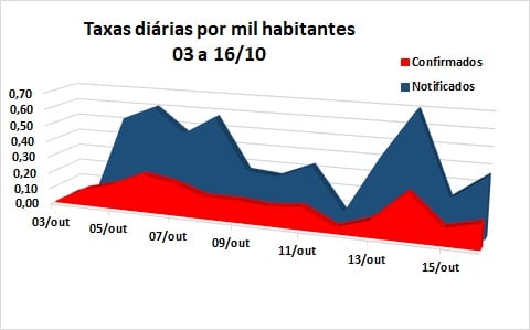 Entretanto, a análise das taxas de notificação e confirmação de contágio diárias, em relação a um grupo de 1 mil habitantes, cujas variações são mostradas no gráfico abaixo (09 a 16/10), apresenta os mesmos 0,13 casos positivos diários, em média, representando um caso para cada grupo de 7.661 habitantes, e aumento (de 0,32 para 0,34) dos casos notificados a cada dia (1 para 2.918 marianenses), considerando a população de 61.288 habitantes, estimada pelo IBGE para este ano.