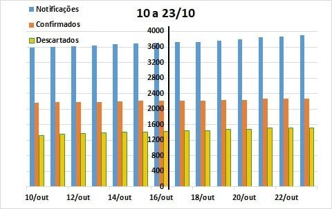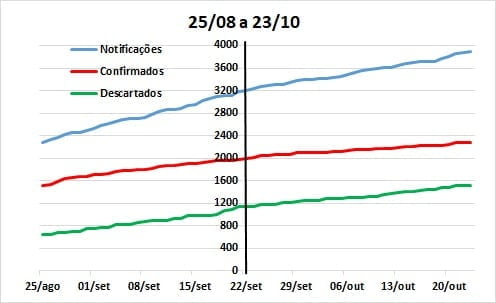 A comparação dos últimos 30 dias (25/09 a 23/10) com igual período anterior à última atualização (17/09 a 16/10), continua demonstrando alteração praticamente inexistente no padrão de crescimento da taxa de notificações, resultados positivos e casos descartados.