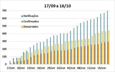 No gráfico acima observa-se que a evolução dos casos notificados e confirmados sofre uma pequena desaceleração desde 27 de setembro, acompanhada de aumento da taxa de casos descartados.