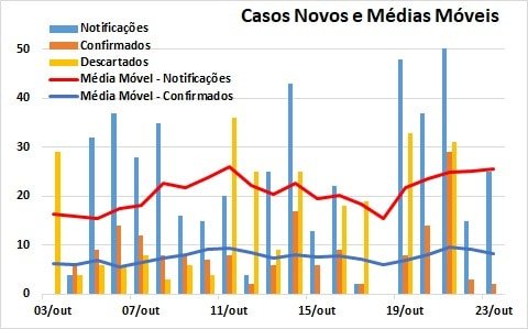 A média móvel máxima diária dos casos confirmados sofreu ligeiro aumento no período dos últimos 7 dias, passando de 9 para 10. Nas notificações não houve variação, mas ocorreu aumento na taxa dos casos descartados, resultando em elevação para 38,5% da relação entre casos confirmados e notificados.