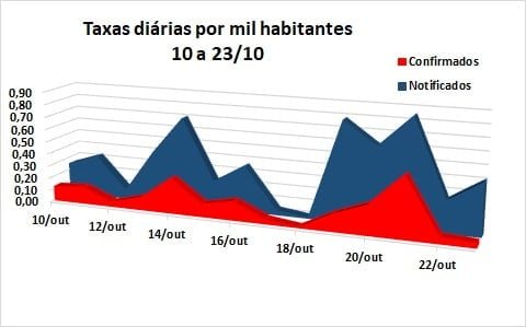 Com isso, as taxas de notificação e confirmação de contágio diárias, em relação a um grupo de mil habitantes, cujas variações são mostradas no gráfico abaixo (10 a 23/10), apresentam manutenção de 0,13 casos positivos diários, em média, representando um caso para cada grupo de 7.593 habitantes; e aumento (de 0,34 para 0,37) dos notificados a cada dia (1 para 2.673 marianenses), considerando a população de 61.288 habitantes, estimada pelo IBGE para 2020.