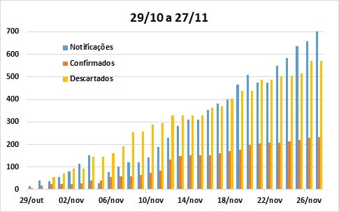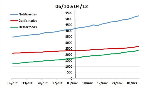 A comparação dos últimos 30 dias, com igual período anterior à última atualização (29/10 a 27/11), reforça as observações anteriores em termos do padrão de crescimento da taxa de notificação (de 23,3 para 24,5%), bem como de elevação significativa dos resultados positivos (de 9,8 para 14,9%). E, mais uma vez, a constatação da tendência de aproximação entre as curvas dos casos descartados e confirmados, embora os casos descartados tenham crescido pouco nos últimos 30 dias (de 35,6 para 37,7%).