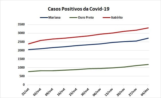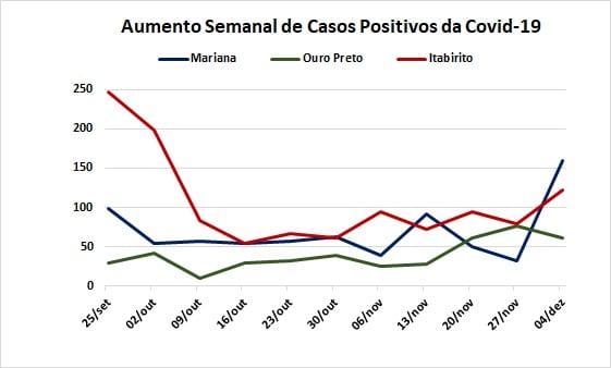 Em outubro e novembro, as médias semanais de crescimento dos casos positivos foram, respectivamente, 3,3 e 2,9%, revertendo uma tendência de queda em relação aos números de agosto e setembro. Entretanto, no período compreendido entre 28/11 e 04/12, o crescimento observado foi de 5%, com 6,3% de aumento em Mariana, 5,5% em Ouro Preto e 3,8% em Itabirito. Nas duas semanas anteriores o aumento em Ouro Preto foi superior ao dos outros dois municípios da região, continuando superior ao de Itabirito no último período.