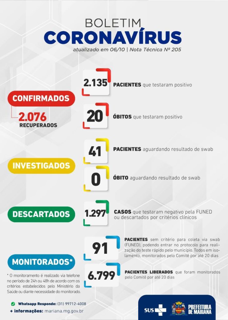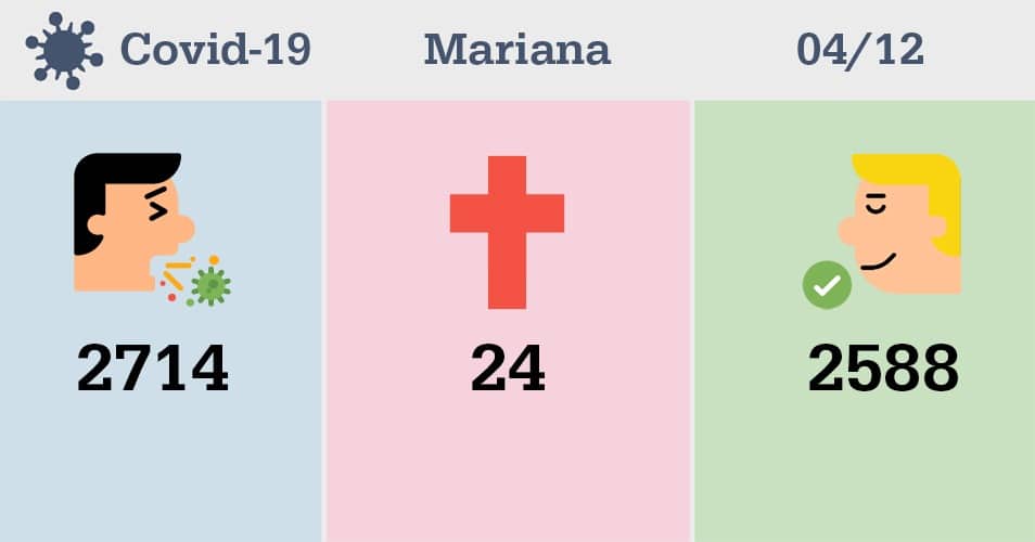 O aumento de 344 casos confirmados na Região dos Inconfidentes eleva esse indicador para o total de 7.206, correspondendo a 5% de acréscimo em relação ao período anterior. Nesta sexta-feira (04) Itabirito completa 57 dias sem registro de vítimas fatais, o último em Mariana foi há 18 dias e, em Ouro Preto, o último óbito foi anunciado no dia 24/11 (há 11 dias).