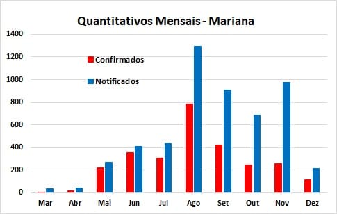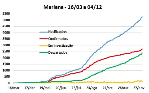 Especificamente no caso de Mariana, no gráfico acima é perceptível a continuidade da tendência de crescimento dos casos notificados e descartados, com ligeira variação para baixo em outubro, mas também mostrando que a diferença entre resultados positivos e descartados continua diminuindo (1,12 casos confirmados para cada caso descartado).