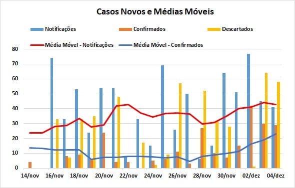 A comparação com os resultados de 14 dias antes (20 de novembro) mostra aumento de 27,5% na média móvel dos casos confirmados e queda de 56,5% na dos casos notificados. A análise desses números é preocupante em termos dos casos confirmados, mesmo considerando a que não se refletiram em aumento significativo de demanda por atendimento hospitalar.