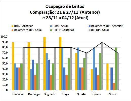 De acordo com os secretários de saúde de Mariana, Ouro Preto e Itabirito, o aumento dos casos positivos não tem se refletido em maior demanda por atendimentos hospitalares. Entretanto, na última semana (27/11 a 04/12), a taxa média diária de ocupação dos leitos de UTI na Santa Casa de Misericórdia, calculada considerando exclusivamente pacientes do novo coronavírus, subiu quase 19 pontos percentuais, atingindo 78,6%. Já no isolamento da Santa Casa e nos leitos da Clínica Médica do Hospital Monsenhor Horta (HMS), as taxas caíram para 30,6 e 66,7%, respectivamente. Ressalte-se que, para o HMS, a média refere-se apenas a seis dias, uma vez que a Nota Técnica nº 263, de 04/12, não havia sido disponibilizada no site da Prefeitura de Mariana até o momento de publicação deste informativo. Ressalte-se que, no período considerado para este informativo, nenhum caso de internação na Santa Casa, em UTI ou leito de isolamento, era de paciente de Itabirito.