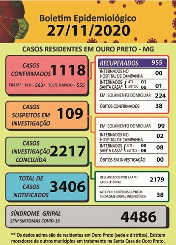 Nota da Redação: Na última atualização do Informativo Covid-19, foi publicado que teriam ocorrido 177 novos casos positivos em Ouro Preto. Nossa reportagem foi induzida ao erro devido a inconsistências do Boletim Epidemiológico do dia 27 de novembro. Como demonstrado ao lado, o total de casos “Recuperados”, “Internados no hospital de campanha”, “Internados na Santa Casa”, “Em isolamento domiciliar” e “Óbitos confirmados” atinge 1.218, mas a soma indicada no quadro “Casos confirmados” é 1.118.