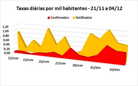 As taxas de notificação e confirmação de contágio diárias, em relação a um grupo de mil habitantes, cujas variações são mostradas no gráfico abaixo (21/11 a 04/12), apresentam nova elevação dos casos positivos diários (0,22 em média), representando um caso para cada grupo de 4.446 habitantes, subindo para 0,65 os casos notificados a cada dia (1 para 1.549 marianenses), considerando a população de 61.288 habitantes, estimada pelo IBGE para 2020.