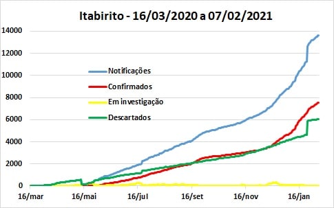 A situação da relação entre casos descartados e confirmados, em Itabirito, foi bruscamente afetada no dia 25 de janeiro, quando foram atualizados, ainda de casos notificados em 2020, com o acréscimo de 1.242 casos descartados. Os dados divulgados no boletim deste domingo (07) indicavam que o município contabilizava 13.645 notificações, 7.571 casos confirmados e 6.028 descartados. Portanto, em comparação com a última semana de janeiro, houve queda de 75,8% de notificações, mas as 460 novas notificações representam aumento de 3,49% em relação ao total verificado no dia 31 de janeiro. Essa sazonalidade também se refletiu nos casos descartados, com queda de 95,2% em relação à semana anterior, mas com 64 novos casos descartados (aumento de 1,07%) em relação ao último dia do mês passado. As relações descartados/positivos e descartados/notificados chegaram, respectivamente, a 79,6 e 44,2%.