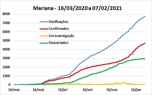 Com 7.765 notificações, 4.728 resultados positivos e 2978 casos descartados, Mariana teve aumento de 3% nos casos confirmados e de 3,8% nos casos descartados, em relação à semana anterior. Com isso, a relação entre descartados e positivos desceu para 63%, enquanto a proporção entre descartados e notificados é de 38,4%, confirmando a tendência de queda observada em edições anteriores deste Informativo.