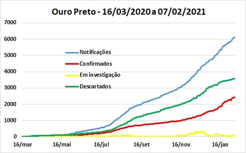 O número de casos descartados em Ouro Preto continua bastante superior ao de confirmados, com relação de 147,6%. Com isso, a relação descartados/notificados é a maior da Região dos Inconfidentes (58,5%). Neste domingo (07), as notificações chegaram a 6.106, com 2.422 confirmados e 3.575 descartados. Apesar disso, nos últimos sete dias, o município teve os maiores crescimentos de casos notificados (65,7%) e de casos confirmados (15,4%).