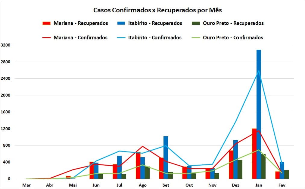 Ao final do período referente a esta atualização do Informativo Covid-19, a taxa global de pacientes considerados recuperados reverteu a queda verificada na última semana de janeiro, atingindo 97,5%, permanecendo Itabirito com o melhor desempenho (98,9%), seguido por Mariana (97,8%) e Ouro Preto (92,4%).