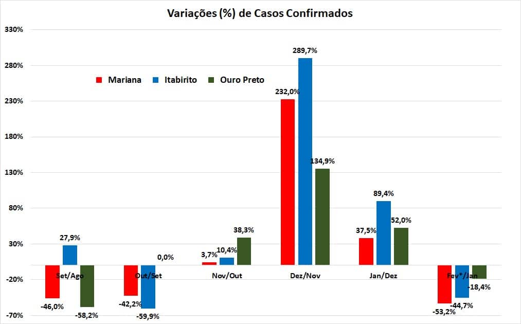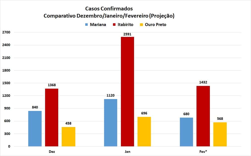 No gráfico abaixo é apresentada, em números absolutos, a projeção para fevereiro dos casos positivos em Mariana, Itabirito e Ouro Preto, ao lado dos números de dezembro e janeiro.