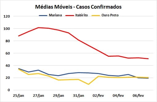 Em termos de médias móveis de casos notificados e confirmados, as variações diárias, ao longo das duas últimas semanas, nas cidades da Região dos Inconfidentes, são apresentadas nos gráficos abaixo. A cada dia, o valor da média móvel é calculado a partir da média do número de novos casos (notificados e confirmados) em sete dias, incluindo o dia de referência. Observa-se que a descontinuidade da média móvel dos casos notificados, ocorrida no dia 25 de janeiro, é revertida a partir do dia 28, descendo a um patamar equivalente ao da primeira semana no ano.