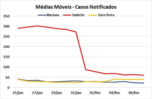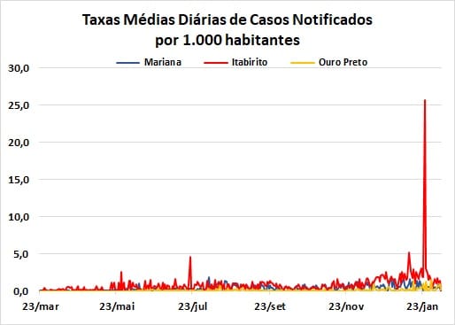 Considerando as estimativas do IBGE (Instituto Brasileiro de Geografia e Estatística) para as populações de Mariana, Ouro Preto e Itabirito, são apresentadas, no gráfico abaixo, as taxas médias diárias dos casos notificados, por grupo de 1 mil habitantes, ressaltando-se, novamente, a situação anômala provocada pelo expressivo número de casos descartados (incluídos no grupo de notificações) incluído no boletim publicado pela Prefeitura de Itabirito no dia 25 de janeiro.