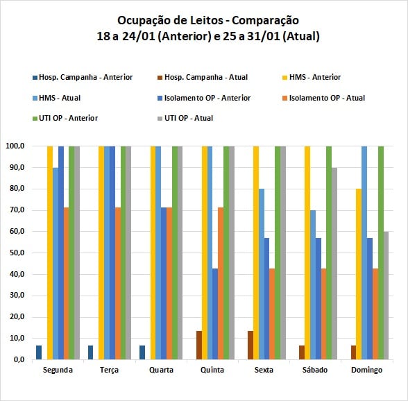 Nos leitos de isolamento da Santa Casa a taxa média diária de ocupação caiu de 69,4 para 57,1%, registrando-se pequena queda também nos leitos da Clínica Médica do Hospital Monsenhor Horta, de 97,1% para 91,7%. Já nos leitos clínicos de ampliação de atendimento (hospital de campanha) em Mariana, a ocupação média diária subiu de 2,9 para 6,8%.