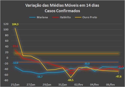 A macrorregião Centro foi reclassificada para a Onda Amarela do Programa Minas Consciente, mas a microrregião formada por Mariana, Ouro Preto e Itabirito permaneceu na Onda Vermelha. Com a liberdade de optar por uma ou outra situação, os municípios da Região dos Inconfidentes optaram por aderir à “progressão de onda”. Os três municípios permaneceram, nos últimos sete dias, na zona de regressão da pandemia, caracterizada por variação das médias móveis de casos confirmados abaixo da linha de -15%. No sábado (06) e domingo (07), as taxas de ocupação dos leitos de UTI (Santa Casa de Misericórdia de Ouro Preto) ficaram abaixo da lotação máxima pela primeira vez desde 10 de janeiro.