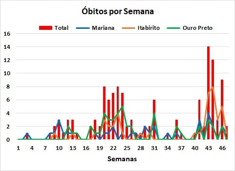A semana registrou duas mortes associadas ao novo coronavírus: uma em Mariana, divulgada no dia 1º, e outra em Itabirito, incluída no boletim do dia 03. O total na Região dos Inconfidentes chega a 129, com 0,88% de taxa global de letalidade (TL = relação entre mortes e casos confirmados) e com 68,5 de taxa de mortalidade (TM = número de óbitos por 100 mil habitantes).