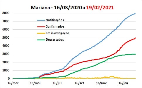 A semana de 15 a 21 de fevereiro registrou 720 casos notificados na Região dos Inconfidentes, com aumento de 7% em relação à semana anterior. Os 489 casos positivos correspondem a uma redução de 5%, observando-se acréscimo de 45,7% dos casos descartados. No total, a Região dos Inconfidentes conta com 28.908 notificações (aumento de 2,55%), 15.725 casos confirmados (+3,21%), 13.038 descartados (+2,12%) e 15.503 (+3,92%) pacientes considerados recuperados, destacando-se que os números de mariana aqui utilizados são referentes a apenas cinco dias.