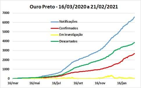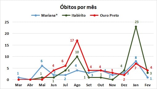 No dia 18, o Boletim Covid-19 da Prefeitura de Itabirito anunciou a inclusão de dois óbitos ocorridos anteriormente. Se acordo com a publicação, um deles aconteceu no dia 02 e o outro no dia 15 de fevereiro, ambos de pacientes internados em Belo Horizonte, enquanto o terceiro, anunciado no dia 20, refere-se a um paciente internado no hospital de Itabirito. Os dois óbitos de Ouro Preto foram anunciados nos dias 16 e 17. Com essas mortes, a Região dos Inconfidentes passa a ter 0,86% de taxa global de letalidade (TL = relação entre mortes e casos confirmados) e 71,7 de taxa de mortalidade (TM = número de óbitos por 100 mil habitantes).