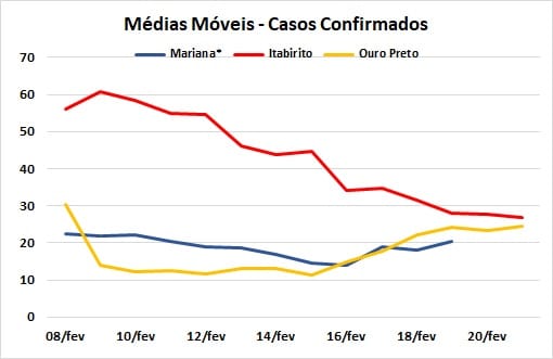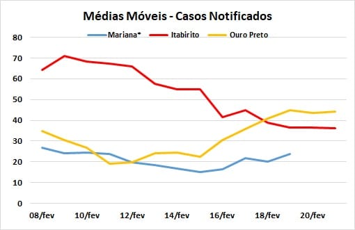 O período de 15 a 21 de fevereiro registrou diferentes variações das médias móveis em Mariana, Ouro Preto e Itabirito, bem como nas comparações com os 14 dias respectivamente anteriores. Em Itabirito as médias móveis diárias, tanto de casos notificados quanto confirmados, mostraram-se decrescentes, ocorrendo o inverso em Mariana e Ouro Preto. No domingo (21), os boletins de Ouro Preto e Itabirito registravam, respectivamente, aumento de 80,2 e queda de 34,1% dos casos notificados. Em termos de casos confirmados, o aumento foi de 89% em Ouro Preto, com diminuição de 38,9% em Itabirito. Em Mariana, a comparação somente pode ser feita para o período de 15 a 19, uma vez que a Secretaria Municipal de Saúde, em comunicação publicada nas redes sociais, feita na última sexta-feira, informou que passaria a divulgar os boletins relativos apenas de segunda a sexta-feira. A medida foi justificada em função da “queda no número de notificações para Covid-19 durante os finais de semana e feriados”. Mesmo assim, em apenas cinco dias, ocorreram aumentos de 34,2 e 10,2% em relação à semana cheia anterior, respectivamente para os casos notificados e confirmados.