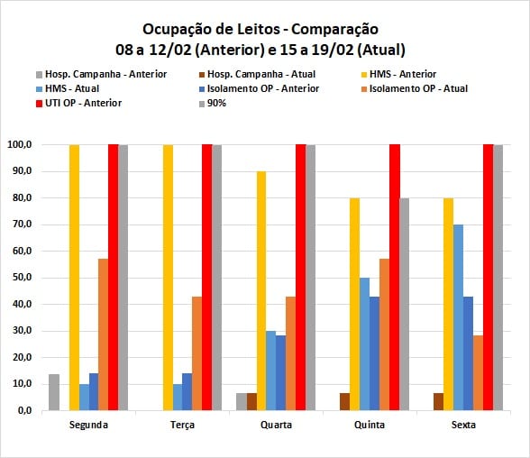 Nos leitos de isolamento da Santa Casa a taxa média diária de ocupação foi de 47,1%, enquanto os leitos da Clínica Médica do Hospital Monsenhor Horta tiveram 34% de ocupação diária e os leitos clínicos de ampliação de atendimento (hospital de campanha) em Mariana somente 4%, com utilização de um leito no período de quarta (17) a sexta-feira (19).