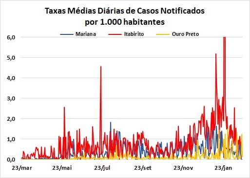 Considerando as estimativas do IBGE (Instituto Brasileiro de Geografia e Estatística) para as populações de Mariana, Ouro Preto e Itabirito, são apresentadas, no gráfico abaixo, as taxas médias diárias dos casos notificados, por grupo de 1 mil habitantes. A representação foi ampliada na faixa de zero a seis para estabelecer, mais uma vez a anomalia provocada pelo expressivo número de casos descartados (que são parte do grupo de notificações) incluído no boletim publicado pela Prefeitura de Itabirito no dia 25 de janeiro. Observa-se que, exceto por um repique, em Itabirito, no dia 09de fevereiro, essas taxas encontram-se em declínio ou com tendência de estabilidade, embora em valores ainda altos.